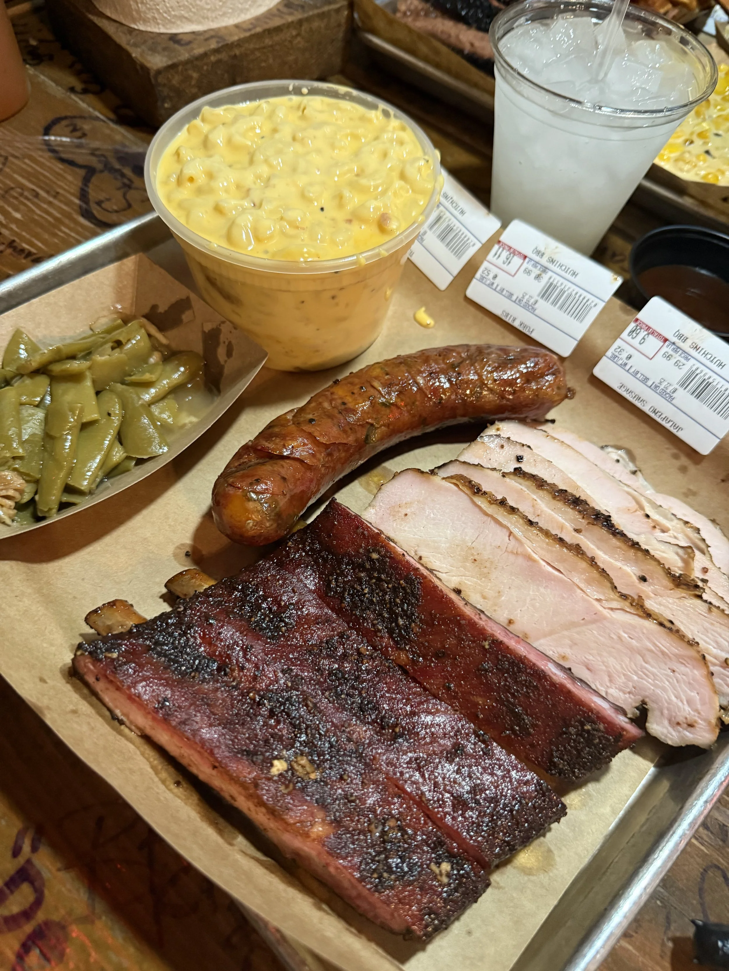 That first bite is a distant memory because I immediately starting asking for ½ pounds of everything. My wife quickly reeled me in and we settled on a ½ rack of pork ribs, ¼ pound of turkey, ¼ pound of brisket and one jalapeno cheddar sausage. He expertly carved up our order and placed it on a tray with weight tags. We slide down the line like the first day of 9th grade and stopped at the sides. Everything is self serve, you pick your container size and fill it up! My wife is Pescatarian so she was really excited for the sides! I got macaroni and cheese and green beans, but I noticed the green beans had meat in it, I mentioned it and she asked an employee if everything had meat in it, he replied “ Baby we in Texas, everything got meat in it! Even the Mac and Cheese!” which while it was hilarious, she was VERY disappointed that she couldn’t get mac and cheese, but she settled on fried Okra, corn, and a baked potato.