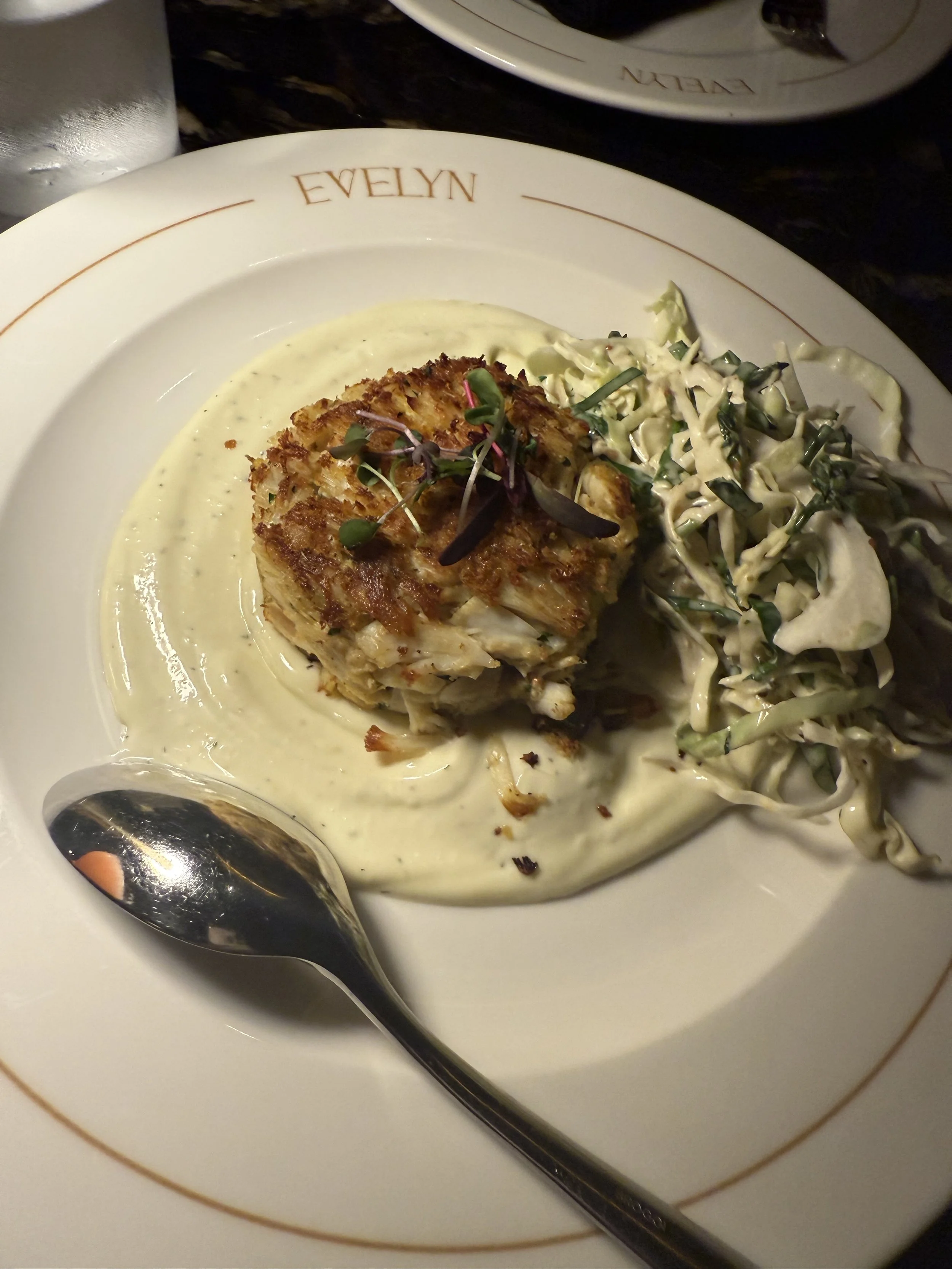 For apps we got the Parker house rolls and the crab cake! The crab tasted like it came from a can, but it was GOOD. The slaw was lovely, and the whipped dip was tasty and a nice change from the usual remoulade. The rolls came with an assortment of whipped butters that were so light and airy! I love a fresh hot roll and these didn't disappoint.